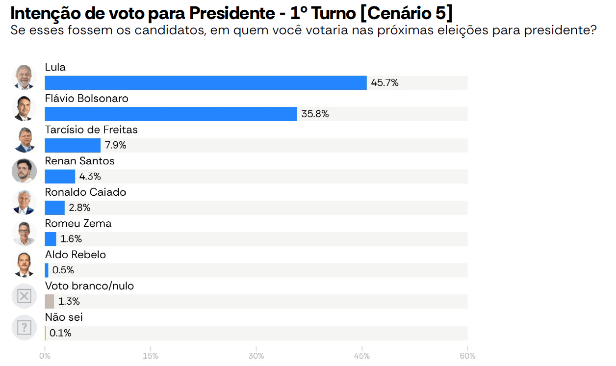 O levantamento ainda perguntou qual resultado da eleição presidencial causa mais "medo ou preocupação": reeleição de Lula para um quarto mandato (47,4%) ou vitória de Flávio (44,5%). A opção "ambos me preocupam igualmente" ficou com 7,4%. Veja detalhes: