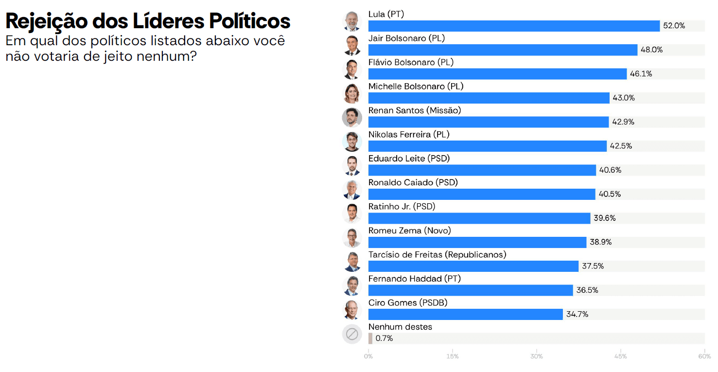 A pesquisa analisou índices de rejeição dos principais políticos brasileiros junto a eleitores. Lula (52%), Jair (48%), Flávio (46,1%), a ex-primeira-dama Michelle Bolsonaro (43%) e Renan Santos (42,9%), filiado ao recém-criado partido Missão e um dos fundadores do Movimento Brasil Livre (MBL), aparecem nas cinco primeiras posições.
