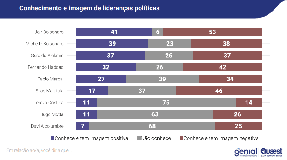 Bolsonaro lidera com folga como nome com maior imagem negativa (53%). Depois dele, aparecem Malafaia (46%) e Haddad (42%). Por outro lado, ex-presidente também é político com imagem positiva mais alta (41%). Abaixo, vêm Michelle (39%) e Alckmin (37%).