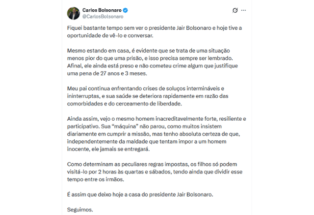 Carlos Bolsonaro visitou o pai, Jair Bolsonaro (PL) na manhã desta quarta-feira (1º) em Brasília. Em post nas redes sociais, o filho do ex-presidente disse que ele tem crises de soluço "intermináveis e ininterruptas". É a primeira visita do filho ao pai após Bolsonaro voltar à prisão domiciliar, na última sexta-feira (27).
