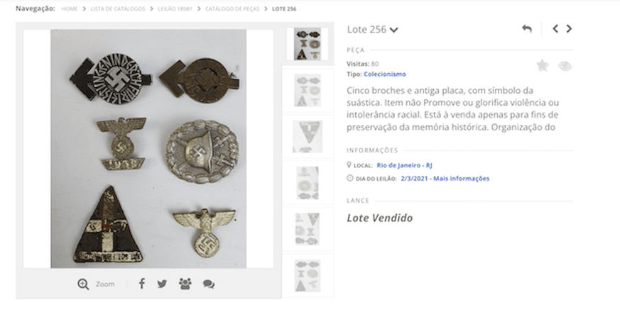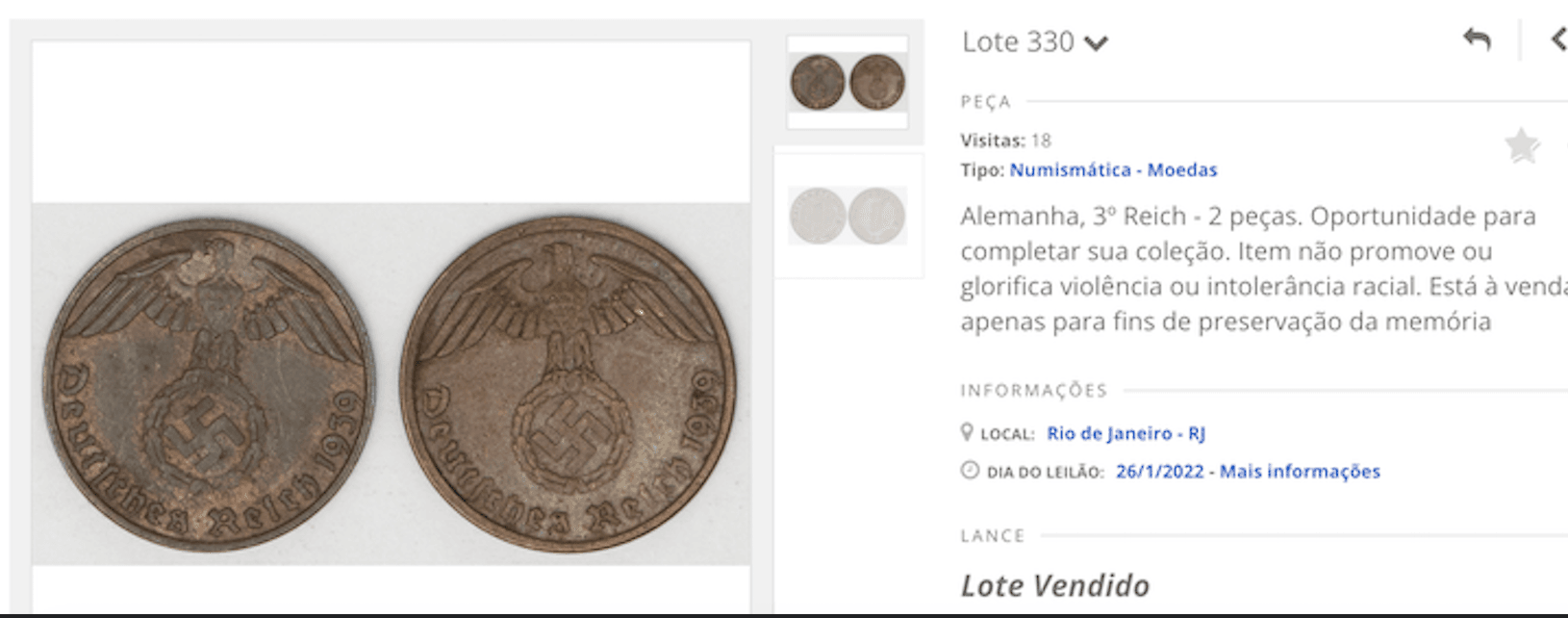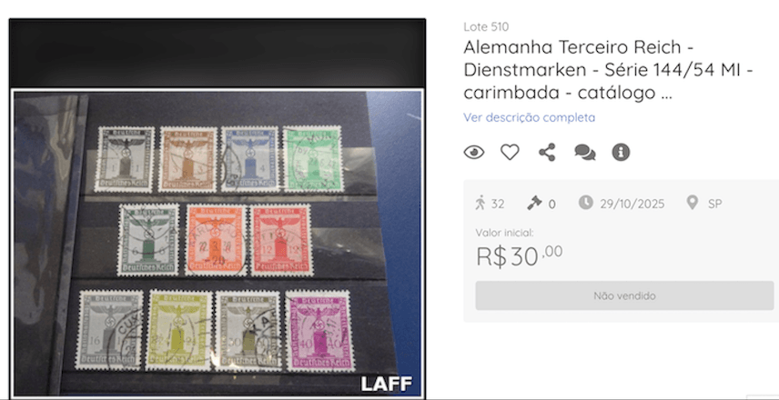 O SBT News pesquisou em plataformas de busca por palavras-chave como “leilão suástica” e “leilão terceiro reich". Sem esforço, foi possível encontrar anúncios de broches, placas e cartões-postais nazistas, com parte dos itens já arrematados por compradores.A representação destaca que os anúncios buscam desvincular a venda de qualquer apologia ao nazismo sob a justificativa do “valor histórico” e/ou “caráter colecionável” das peças.
