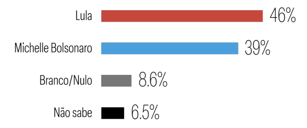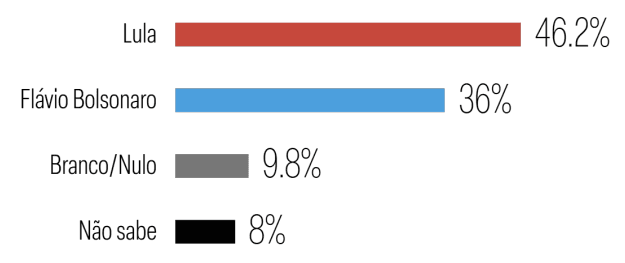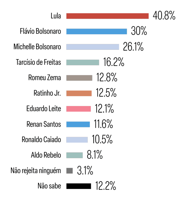 O levantamento também testou rejeição de candidatos entre eleitores. Aparecem no topo da lista Lula (40,8%), Flávio (30%) e Michelle (26,1%).