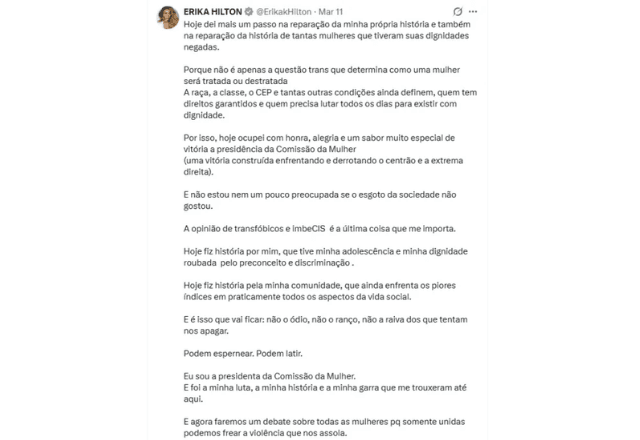 Na semana passada (11), Erika Hilton fez uma publicação após ser eleita para a presidência da Comissão da Mulher.