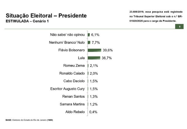 Pesquisa estimulada realizada no Rio de Janeiro pelo instituto Paraná Pesquisas para a Presidência da República mostra Flávio Bolsonaro (PL) com 39,6% das intenções de votos, e Lula (PT), com 36,7%. Romeu Zema (Novo) aparece em terceiro, com 2,1%, e Ronaldo Caiado (PSD), com 2%. Os demais pré-candidatos têm menos de 1,5%. Votos brancos ou nulos somam 7,7%. Já os indecisos representam 6,1%.
