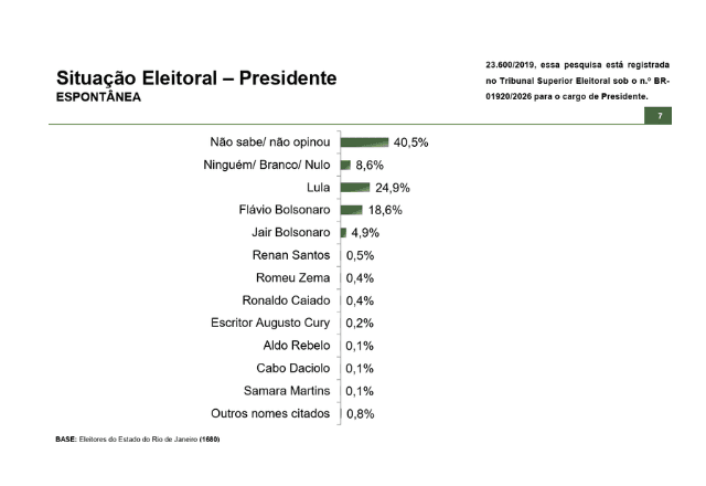 Já na pesquisa espontânea, Lula surge com 24,9% e Flávio Bolsonaro com 18,6%. O ex-presidente Jair Bolsonaro (PL) aparece em terceiro lugar com 4,9%. Renan Santos (Missão) é lembrado para 0,5% dos entrevistados. Zema e Caiado aparecem com 0,4% cada.