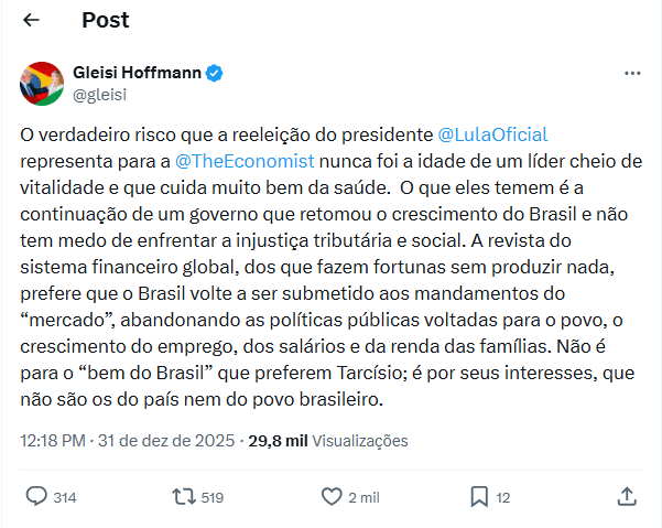 Em rede social, Gleisi defende o presidente dizendo que “o verdadeiro risco que a reeleição do presidente Lula representa para a The Economist nunca foi a idade de um líder cheio de vitalidade e que cuida muito bem da saúde. O que eles temem é a continuação de um governo que retomou o crescimento do Brasil e não tem medo de enfrentar a injustiça tributária e social.”