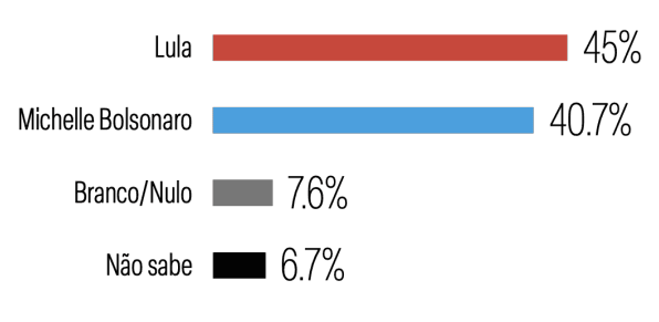 A diferença de Lula para esses três candidatos fica dentro da margem de erro, que é de 2,5 pontos percentuais (p.p.). O petista marca 45,8% a 41,1% contra Flávio, 44,7% a 42,2% de Tarcísio e 45% a 40,7% de Michelle. O levantamento entrevistou 1.500 pessoas de 30 de janeiro a 2 de fevereiro, com intervalo de confiança chegando a 95%.