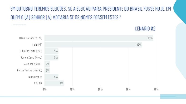 Em um segundo cenário, com a inclusão do governador do Rio Grande do Sul, Eduardo Leite (PSD), Flávio Bolsonaro tem 39% e Lula 35%. Leite aparece com 5%, empatado com Zema. Aldo Rebelo e Renan Santos mantêm 2% cada. Veja: