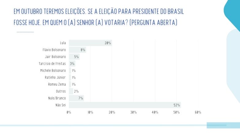 Na pergunta espontânea, quando não são apresentados nomes de candidatos aos entrevistados, Lula lidera com 20% das menções, seguido por Flávio Bolsonaro, com 8%.