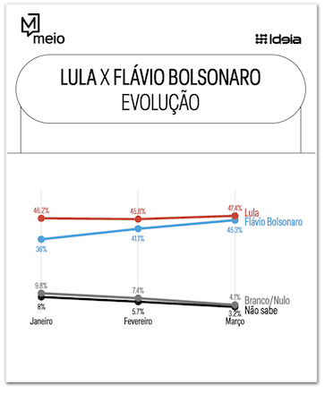 Em fevereiro, Lula tinha 45,8%, contra 41,1% de Flávio. Agora, essa diferença é de 47,4% a 45,3%, com Flávio somando 1,7 ponto acima da margem de 2,5 p.p.