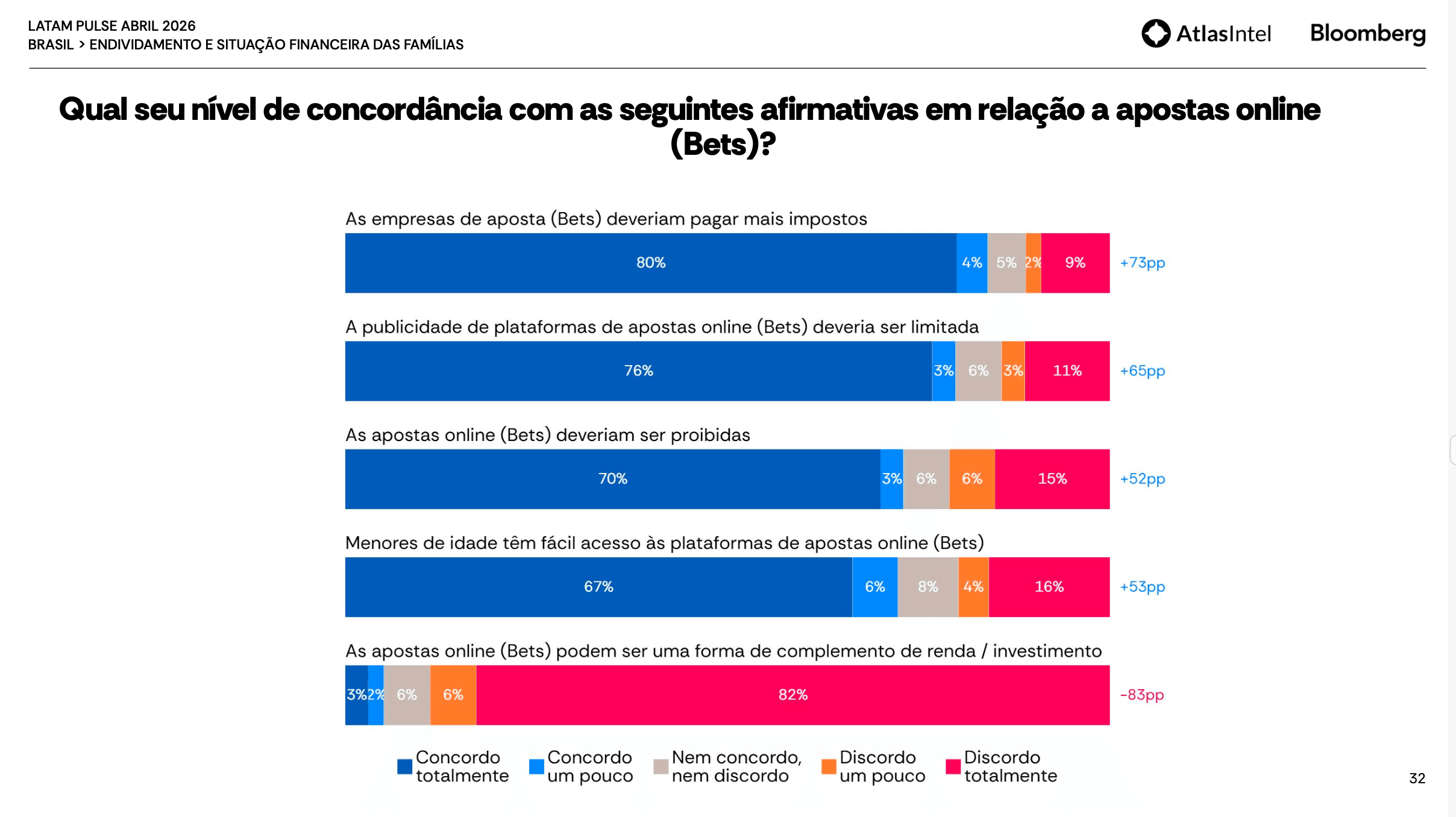 Outro tema econômico de destaque abordado é a regulação das empresas de apostas esportivas, as famosas bets. A grande maioria da população é crítica da disseminação deste mercado: 63,2% dizem que só traz prejuízos e 23,5% acreditam que os prejuízos superam os benefícios. Apenas 0,6% enxergam benefícios.