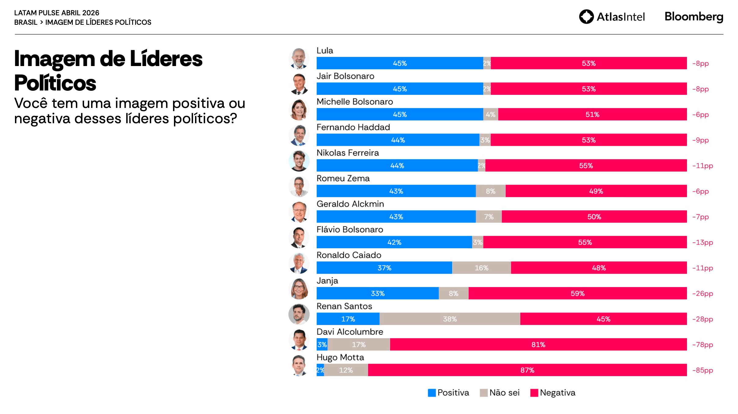 Ao todo, o levantamento questionou os brasileiros sobre sua visão acerca de 13 políticos e autoridades. O presidente Lula (PT), o ex-presidente Jair Bolsonaro (PL) e a ex-primeira-dama Michelle Bolsonaro lideram com 45% de avaliações positivas. O trio, porém, é desaprovado pela maioria: de 51% a 53%.