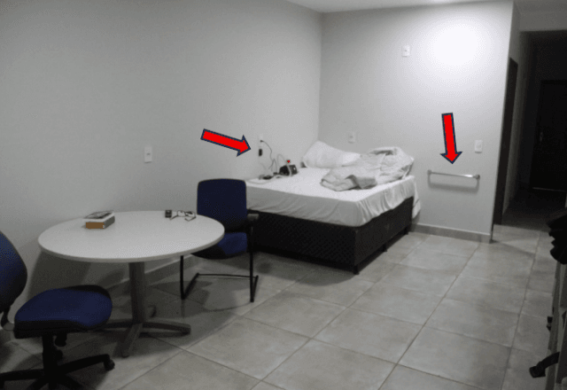 Vista do quarto-sala: as setas mostram a campainha de pânico/emergência e a barra de apoio perto da cama | Reprodução