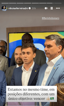 “Obviamente, todas as nossas candidaturas vão te servir, Flávio, para você derrotar o PT, porque ninguém aguenta mais o Lula, ninguém aguenta mais a esquerda. Minas teve uma diferença, na eleição do seu pai, de apenas 50 mil votos. Ou seja, cada voto agora importa. Eu digo que nós somos do mesmo time, com posições diferentes, mas contra o mesmo inimigo. E o objetivo é só um: vencer, porque o Brasil, de fato, está em jogo", disse o deputado em vídeo publicado nos stories do Instagram.