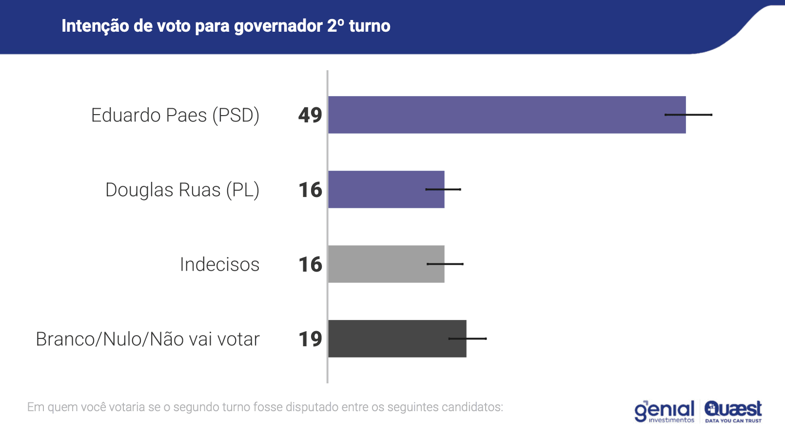 Em eventual disputa de segundo turno, Paes também emerge como favorito. No embate direto com Ruas, o ex-prefeito tem 49% contra 16% do presidente da Alerj.