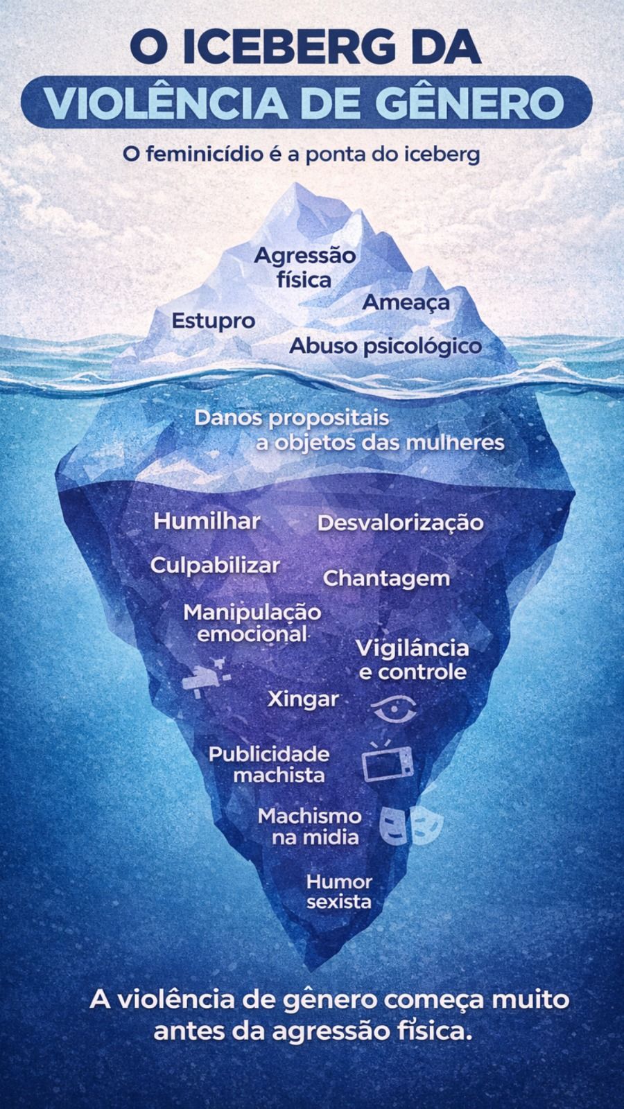 Na metáfora visual "Iceberg da violência de gênero", proposta pelo Instituto Avon, questões como a invisibilidade de mulheres, o humor sexista, o machismo na mídia e a publicidade machista são tidas como as mais brandas na escala da violência de gênero. Em outra camada, aparecem condutas como xingamentos, vigilância e controle e manipulação emocional; e, por fim, crimes como estupro, agressão física e ameaça.