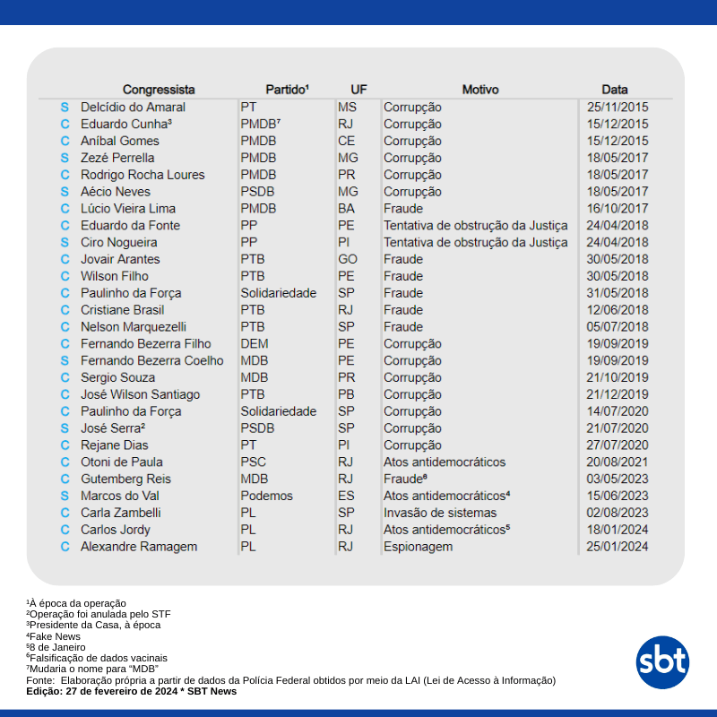Dentre as 27 buscas já realizadas, a mais antiga identificada pelo SBT News, em um levantamento próprio considerando o período a partir de 1988, foi em 25 de novembro de 2015, quando o alvo foi o então líder do governo Dilma Rousseff (PT) no Senado, Delcídio do Amaral (PT-MS).