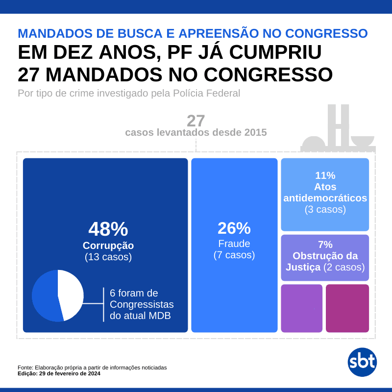 A articulação dos congressistas em torno da PEC da Blindagem foi motivada pelas recentes buscas contra o líder da oposição na Câmara dos Deputados, Carlos Jordy (PL-RJ), e pelo deputado federal Alexandre Ramagem (PL-RJ). No entanto, elas estão longe de serem as primeiras feitas pela Polícia Federal (PF) contra parlamentares no Congresso Nacional. Nos últimos dez anos, já foram cumpridos ao menos 27 mandados de busca e apreensão por diversos crimes. Entre eles estão investigações sobre corrupção, fraude, tentativa de obstrução de justiça, atos antidemocráticos, invasão de sistemas e espionagem.