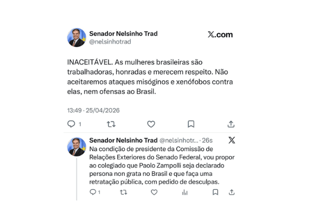 O presidente da Comissão de Relações Exteriores e Defesa Nacional do Senado, Nelsinho Trad (PSD-MS), disse que as declarações de Paolo Zampolli sobre as mulheres brasileiras são inaceitáveis e causam indignação. Para o senador, o enviado especial para assuntos do governo Trump deve ser declarado persona non grata pelo Brasil, além de pedir desculpas pelas ofensas.