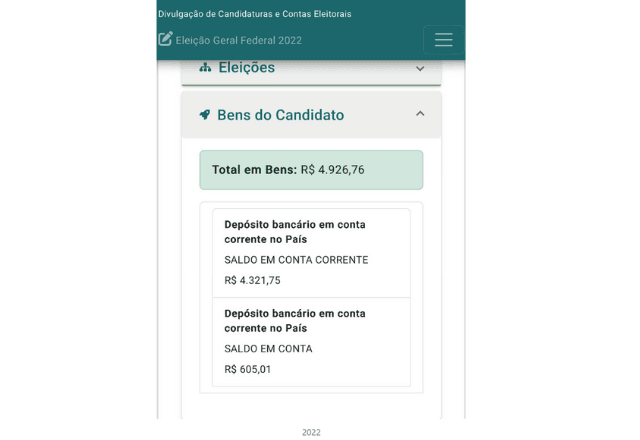 Apesar de o salário de um deputado federal ser hoje de R$ 46,4 mil, Sóstenes declarou ter empobrecido 4 anos depois, com patrimônio de apenas R$ 4.926,76 em 2022.