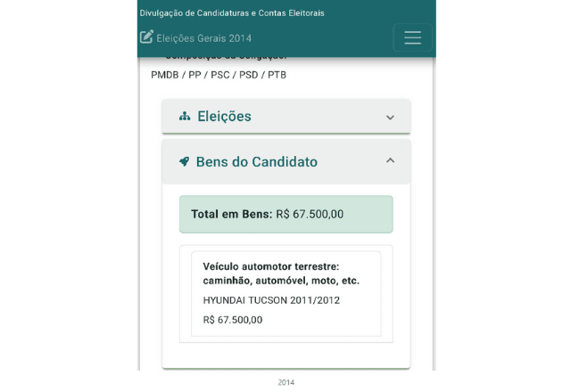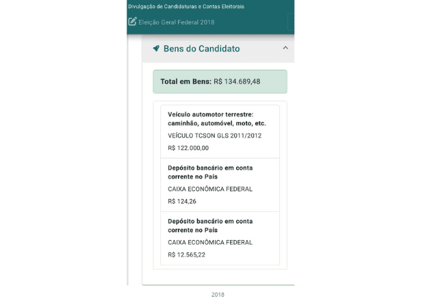 Seus bens totalizariam, segundo essas declarações, R$ 67 mil em 2014 e R$ 135 mil em 2018.