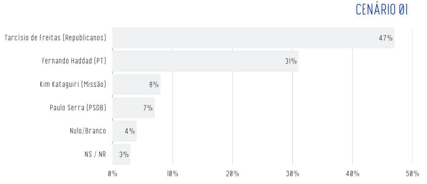 Em um primeiro cenário estimulado, em que o instituto apresenta os candidatos, Tarcísio tem 47% das intenções de voto, enquanto Haddad aparece com 31%. Em terceiro, está o deputado federal Kim Kataguiri (Missão), com 8%, seguido pelo ex-prefeito de Santo André, Paulo Serra (PSDB), com 7%. Nulos e brancos são 4%. Não souberam ou não responderam, 3%. Veja cenário: