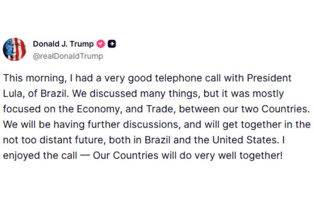 "Nesta manhã, eu fiz uma chamada telefônica muita boa com o presidente Lula, do Brasil. Nós discutimos muitas coisas, mas a conversa focou principalmente na economia e no comércio entre os dois países", declarou o norte-americano. "Nós teremos futuras discussões e nos reuniremos em um futuro não muito distante, tanto no Brasil quanto nos Estados Unidos. Eu gostei da ligação — nossos países irão muito bem juntos!", escreveu Trump.