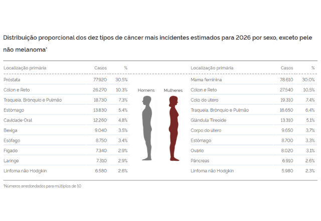 Entre os homens, o câncer de próstata segue como o mais incidente, respondendo por 30,5% dos casos, seguido pelos tumores de cólon e reto (10,3%), pulmão (7,3%), estômago (5,4%) e cavidade oral (4,8%).