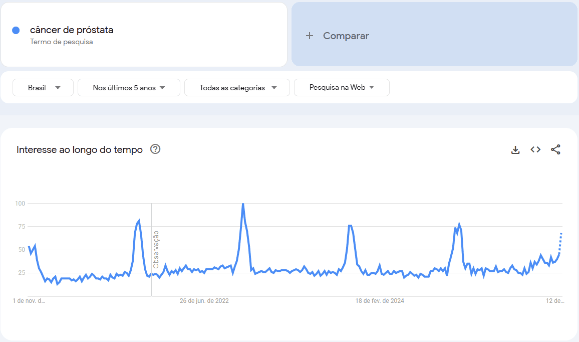 Uma pesquisa realizada pela plataforma Google Trends revelou que nos últimos 5 anos o termo “câncer de próstata” teve um pico de buscas especificamente no mês de novembro. Com a chegada do mês, homens têm frequentado mais consultórios, hospitais e médicos urologistas e consequentemente, pesquisado mais sobre o assunto.