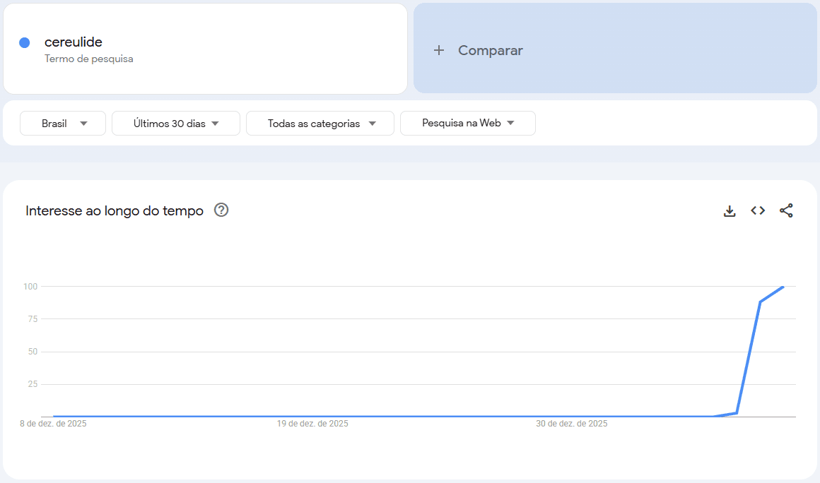 Com o anúncio da Anvisa, as buscas por "cereulide" no Google aumentaram em comparação com os últimos 30 dias, registrando um pico de interesse nesta quinta-feira (8). Os dados são do Google Trends, ferramenta que exibe os termos mais populares no buscador.
