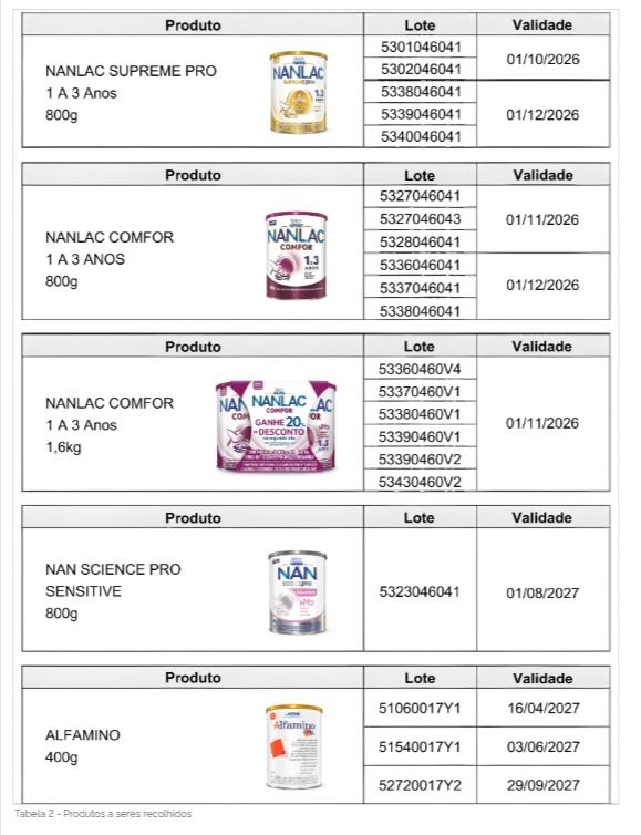 A Agência Nacional de Vigilância Sanitária (Anvisa) anunciou nesta quarta-feira (7) a proibição da comercialização, distribuição e uso de alguns lotes das fórmulas infantis Nestogeno, Nan Supreme Pro, Nanlac Supreme Pro, Nanlac Comfor, Nan Sensitive e Alfamino, da Nestlé Brasil.